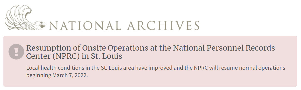The National Personnel Records Center just announced it will resume full operations starting Monday March 7th, 2022: