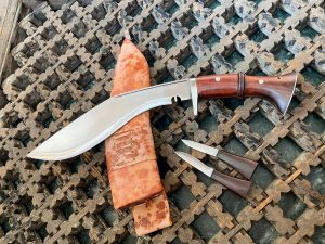 “Most Kukri feature two little knives attached at the back of the sheath held either in a built-in pocket or a leather purse is the complete set. The small sharp knife is a Karda, it serves as a small cutting knife. The other knife is called a Chakmak. It is blunt on both sides and it works like a knife sharpener when one does not have a sharpening stone rubbing both sides of a kukri. This Chakmak when stroked against a lime stone created sparks to start fire also.”