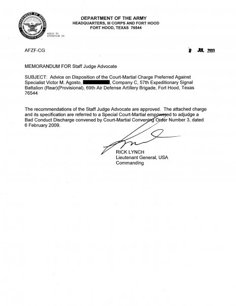 Yesterday there was a bit of news, though. Apparently, his commander has recommended and approved a Special Court Martial. Of course the Left is outraged that he’s being persecuted. One blog even went so far as to call it a lynching – probably for the racial undertones of the use of that word. Since Agosto continues to provide us with a paper trail to his jail cell, I’m willing to publish it;