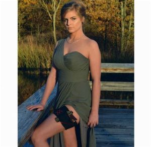 Notice that the ironware on today’s green garbed Ms Thang’s thigh appears to be a 1911 Commander or Officer’s Model. Make, model, and caliber unknown, but she carries it very well.