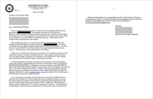 We supplied her with two FOIA requests and encouraged her to file with both the US Army and NPRC because if there were multiple “no records found” responses, it could make for a better case. We also said that it is better to hit someone with overwhelming evidence all at once vs. trickle out some head-scratching details that don’t add up. For the former, they sometimes come clean. For the latter, i.e. trickle out, they sometimes will use that to modify the story and in an odd sense they are helped to polish up a lie.