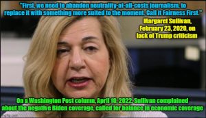 This is the same Margaret Sullivan who, on February 23, 2020, and on November 8, 2020, wrote articles complaining about the lack of criticism against Trump in the media. In contrast to her complaint about ignoring the good economic numbers under Biden, she had no problems ignoring hard evidence exonerating Trump from what he was impeached for. She also ignored Donald Trump facts related to what was good news for the country.