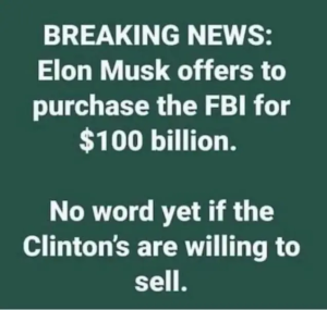 Another Sunday of great toons. I like the one with Musk maybe buying clinton’s fbi (federal bureau of imbiciles)