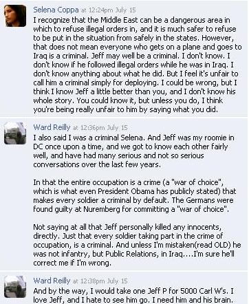 Jeff Peskoff, the member of our little community here at TAH who resigned from IVAW this morning “friended” me at Facebook so I could witness the drama over there as another valued IVAW member left the fold. It’s instructive to read what influence the old VFP/VVAW members hold over the younger members. After the letter that I posted this morning, Jeff wrote;