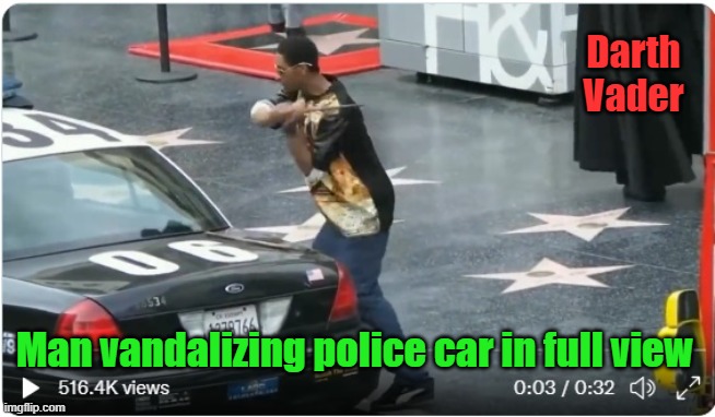 Old news, from 2014, but still similar to crimes that continued to happen during the following years. Someone wearing a Darth Vader outfit walks into the scene in the background. Then, Leyston Dontail Rice proceeds to smash the windows before walking off with a laptop taken from the vehicle.