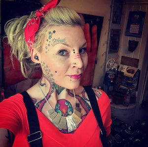The Brit runs a body-piercing business and has multiple piercings, tattoos and modifications, including a split tongue, scarification, skin removal and implants.