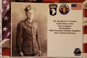 He volunteered for the Army’s paratroopers after the start of World War II. Freeman was trained as a mortarman and participated in the June 6, 1944, invasion of Normandy and the attempted bridgehead over the Rhine River in “Operation Market Garden” in Holland. Freeman also on to fight in the defense of Bastogne known as the “Battle of the Bulge,” where he was wounded. He was able to recover from his injuries and rejoin his unit and participated in the occupations of Berchtesgaden, Germany, and Austria toward the end of the war.