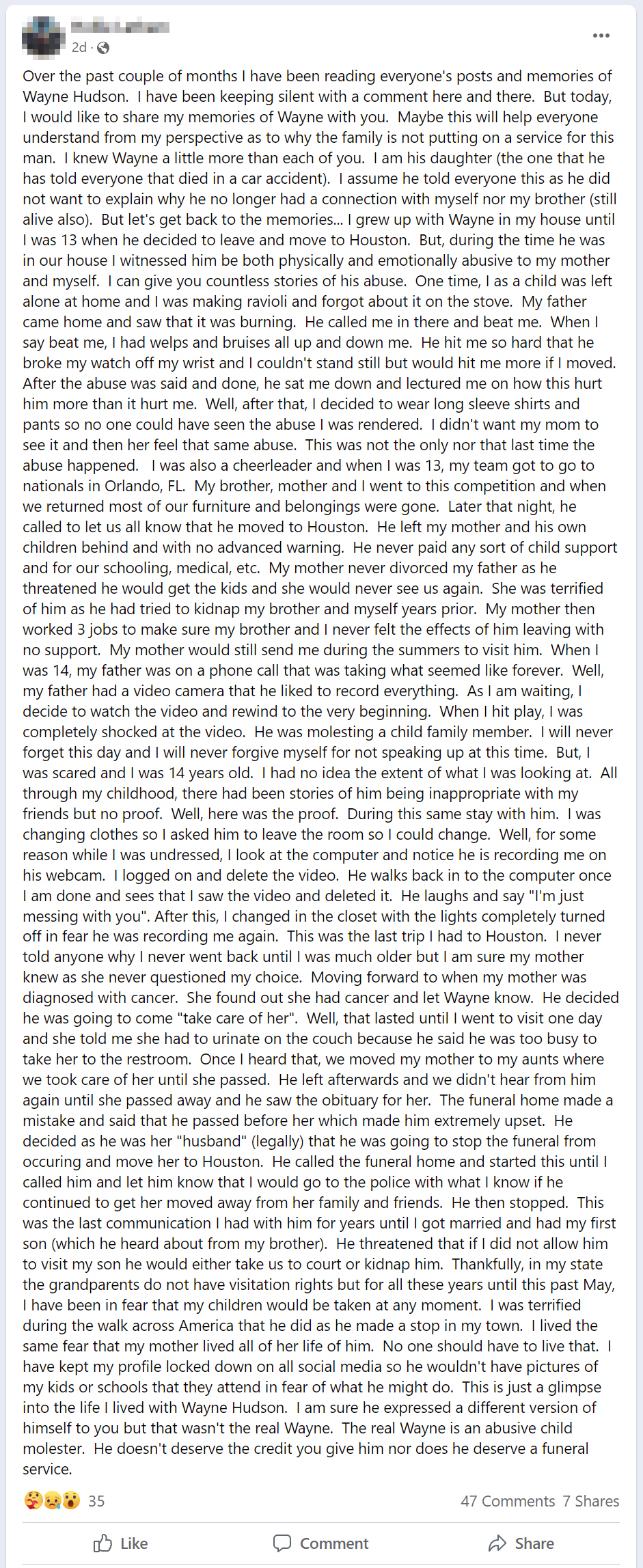 Apparently, a daughter that Hudson claimed was killed in a car accident came back from the dead and explained why the family was not giving him a funeral, citing physical abuse and child molestation.
