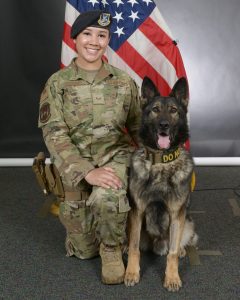 While serving together, Akim had a near-death experience after accidentally swallowing a bee and suffering from an extreme allergic reaction. SrA Jenna leaped into action as Akim went into anaphylactic shock, picking up the 70-pound dog and running him to the veterinarian at the base. Thanks to her quick action, Akim survived. SrA Jenna spent the next two days by his side and even slept with him in his kennel to keep him company. From that day forward, SrA Jenna always had an EpiPen on hand.