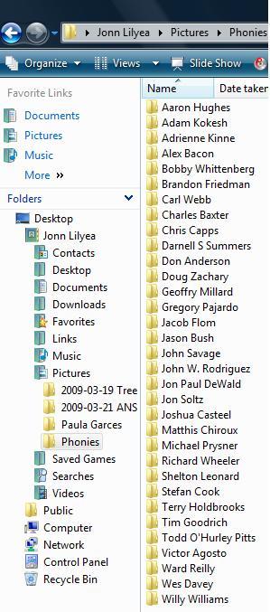The other day, I had a conversation with some people who worried they were on our list of folks we’re investigating. I guess that’s the drawback of doing what I do – folks spend most of their conversation with me explaining why their stories might not match their files. I think it’s funny, but to put people’s minds at ease, here’s a screen shot of my “Phonies” files. They might not be phonies, but I’m keeping my eye on them. Some of them you’ve read about before, they’re just a continuing saga.