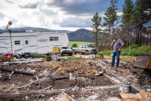 He, his wife Lori, three teenage children, four dogs and eight cats are living in a camping trailer next to the ashes of their home in Tierra Monte, 35 miles northeast of Santa Fe.