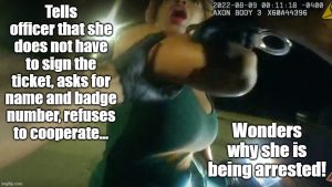 “I’m going to sign the ticket now,” she says as he tries to put handcuffs on and tells her it’s too late to sign the ticket. “Why am I being arrested?”