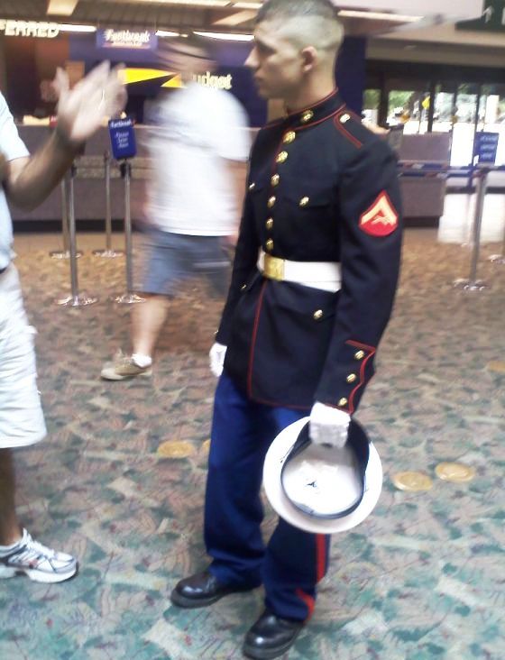 GySgt Ableman was keen enough to spot this douche-bag walking through the Reno Airport in full dress blues with gloves and cover on. He stopped him near the baggage claim and running into three Drill Instructors wasn’t something this guy had anticipated.