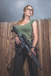 Ms Thang might be sporting a set of custom made breast works, but there is nothing fake about that scary black rifle.