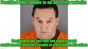 Investigators leveraged advances in DNA technology, and the presence of ancestry websites, to solve a cold case murder. Taking the DNA from the crime scene, investigators worked with a DNA/ancestry website to find a possible match. Using social media, they discovered that their man of interest was planning to go to a game. He went to that game, ate a hotdog, then discarded a paper napkin after wiping his mouth with it.