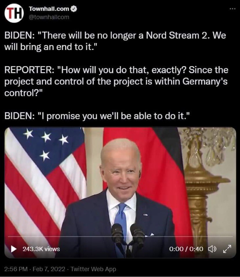 Tucker Carlson furthered the case of potential Biden admin involvement on his show last night, noting of Biden’s language; “Notice how he phrased that. He didn’t say, ‘I will pause the delivery of gas from Russia to Germany.’ He said there won’t be a Nord Stream 2. We’ll put an end to it. We’ll take it out. We’ll blow it up.”