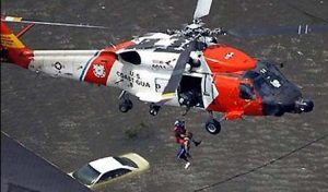 One of the houses they arrived at had an older couple whose roof was torn off. They were stuck in a back bedroom because a couch had been lifted up by the hurricane and positioned in such a way that they were unable to exit. The woman is disabled and uses a specialized wheelchair tailored to her individual needs. Because of the inaccessibility, Loesch was forced to tear through the wall to gain access to the room. He was successful in retrieving the man and woman plus their dog. Loesch even went back and attached a hoist to her wheelchair and hauled it and himself out so the woman would be able to get around once they were evacuated.