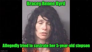 Bracey Renee Byrd, 33, was arrested Friday and charged with attempted murder, felony child abuse inflicting serious bodily injury, malicious castration, first-degree kidnapping and three counts of felony child abuse with physical injury.