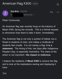 Pitzer College event staff manager and student, Zoe Brin, recently sent out a formal request to students demanding the American flag be taken down from one of the campus residences.