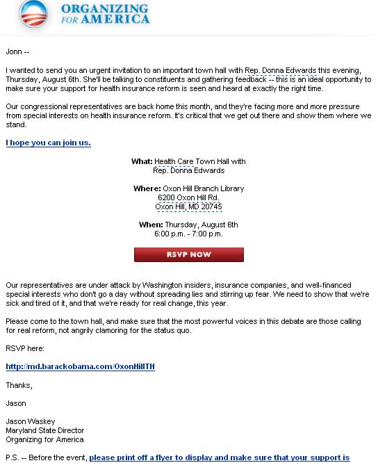 I just got this email from my local Obama Love Chapter Head Koolaid Dispenser here in Maryland. He wants me to go outside of my district to attend another Congress person’s town hall meeting;