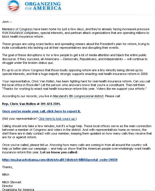 Well, maybe they just sent it to me because it’s hard to keep track of who lives where among all of the Obaminions in Maryland. Except that I got this email right after the first one telling me that “according to their records” I live in Maryland’s eighth district and would I please call my congressman, Chris VanHollen, to give him moral support in this grueling battle against “scare tactics”.