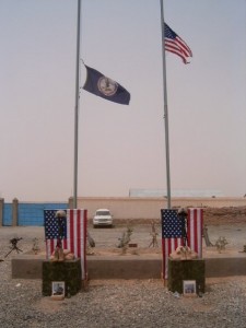 The battalion stood in front of an ad-hoc memorial — made not of stone or marble but of plywood, 2×6’s and nails painstakingly crafted into a temporary tribute by the guardsmen.