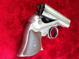 So, apparently yesterday’s gun is a Remington 5 shot derringer, 22 caliber (S? L? LR?), w/fixed barrel and rotating firing mechanism.