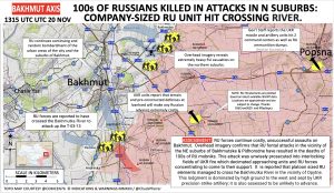But where the Ukrainian counteroffensives resulted in major breakthroughs for the Ukrainians–and galloping retreats by local Russian troops–the Russian countercounteroffensive is a brutal, bloody slog that appears to be killing more Russians than Ukrainians. Worse for the Russians, they’re not gaining significant ground.