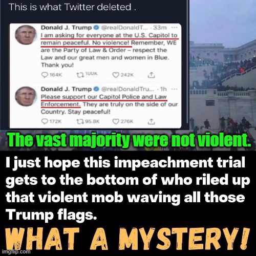 In terms of Trump’s tweet that said let’s be peaceful, that was at 2:38pm, well after most of the violence. And to my second point, if there’s evidence that he or others were planning to encourage enough violence or chaos to interrupt the certification of the votes, then that carriers more weight than tweets for peace after the fact, too.
