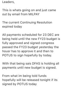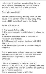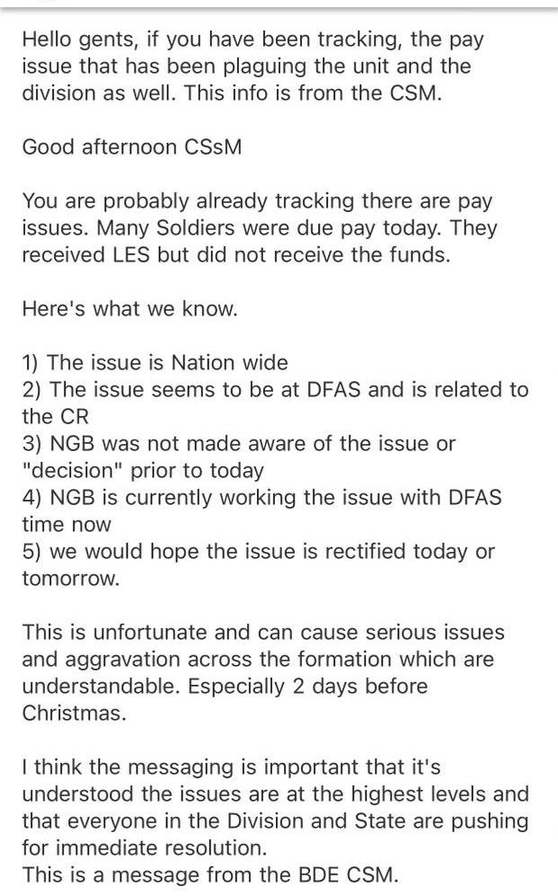 Many National Guard Soldiers across the country did not get their final pay for the year, which was scheduled before Christmas. The continuing resolution that temporarily funded the government expired before the checks could be issued, so pay was put on hold pending approval of the budget for the current fiscal year.