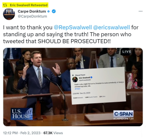 The stupid has been strong this week. We start with Representative Eric Swalwell (D-CA) retweeting a Carpe Donktum meme. It was a video meme to boot, in which Swalwell can be heard breaking wind loudly, as he is known for doing on television. Click the photo to watch it.