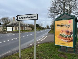 The sign, advertising the fast food chain’s McCrispy burger, is right next to a crematorium sign and has been placed on a bus stop directly opposite Penmount Crematorium on the road between Truro and Carland Cross.