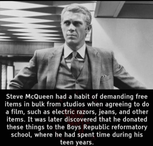 Steve McQueen, who actually lived a fascinating life from birth onwards, did way more for charity, kids and orphans then sending them goodies from the movie studio. He did it for the best of reasons too.
