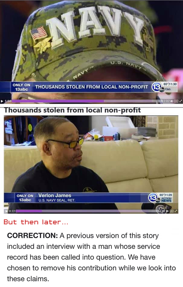 A news organization did a story about a charity that had funds stolen from them. James has been interviewed for the story, but later, when questions arose regarding his military claims, they pulled back on the story.