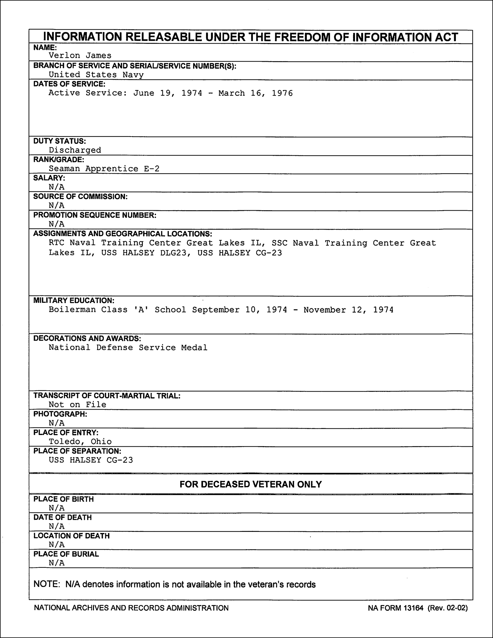 Verlon James’ military records were ordered through a Freedom of Information Act (FOIA) request.