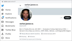 The folks at MilitaryPhony send us their work on Verlon James, who claims to have been a Navy SEAL, served in Vietnam and Iraq, and retired after 20 years. James comes to us from Toledo, Ohio and at the time of this writing is 66 years old.
