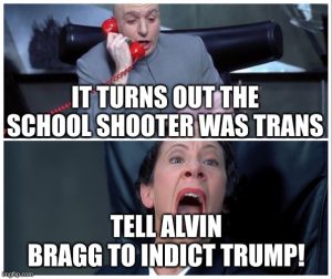 According to multiple reports, Manhattan DA Alvin Bragg has secured a felony indictment against former President Trump. That should get everyone’s attention off the school shooter’s myriad mental illnesses.