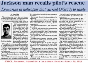In Jonn’s blog about Morton, there are military records and a newspaper article from the Southeast Missourian, which spoke about Morton’s account of the rescue mission. There was no mention of his injuries, but instead, the article focused on the 1995 O’Grady rescue mission.