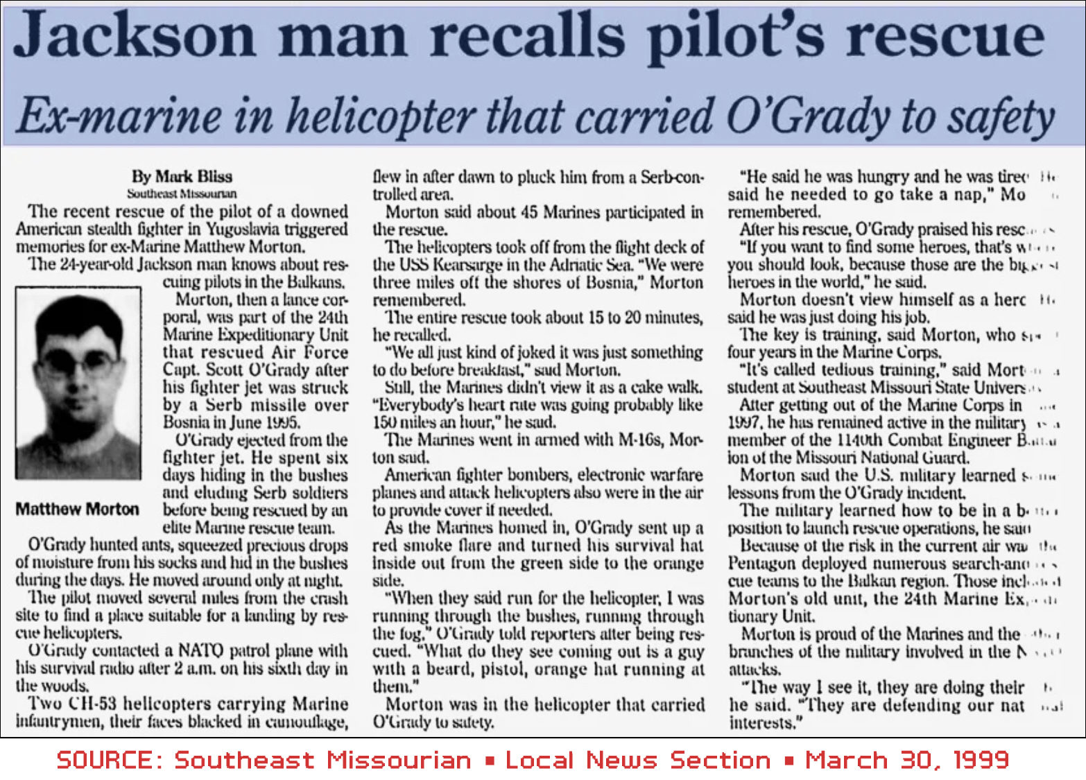 ASSIGNMENTS Morton was assigned to the overall MEU that was involved in the Captain Scott O’Grady rescue effort in 1999. The pilot that helped with the original blog stated that Morton was not on the roster of 61 individuals that were part of the rescue. We will leave this claim to those knowledgeable about the event.