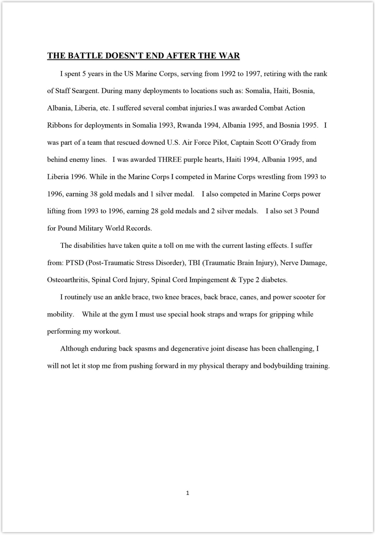 Although Morton had been initially called out on his martial arts claims, there was no mention of his disabilities or Marine Corps combat-related injuries as he has claimed. This was 2016.