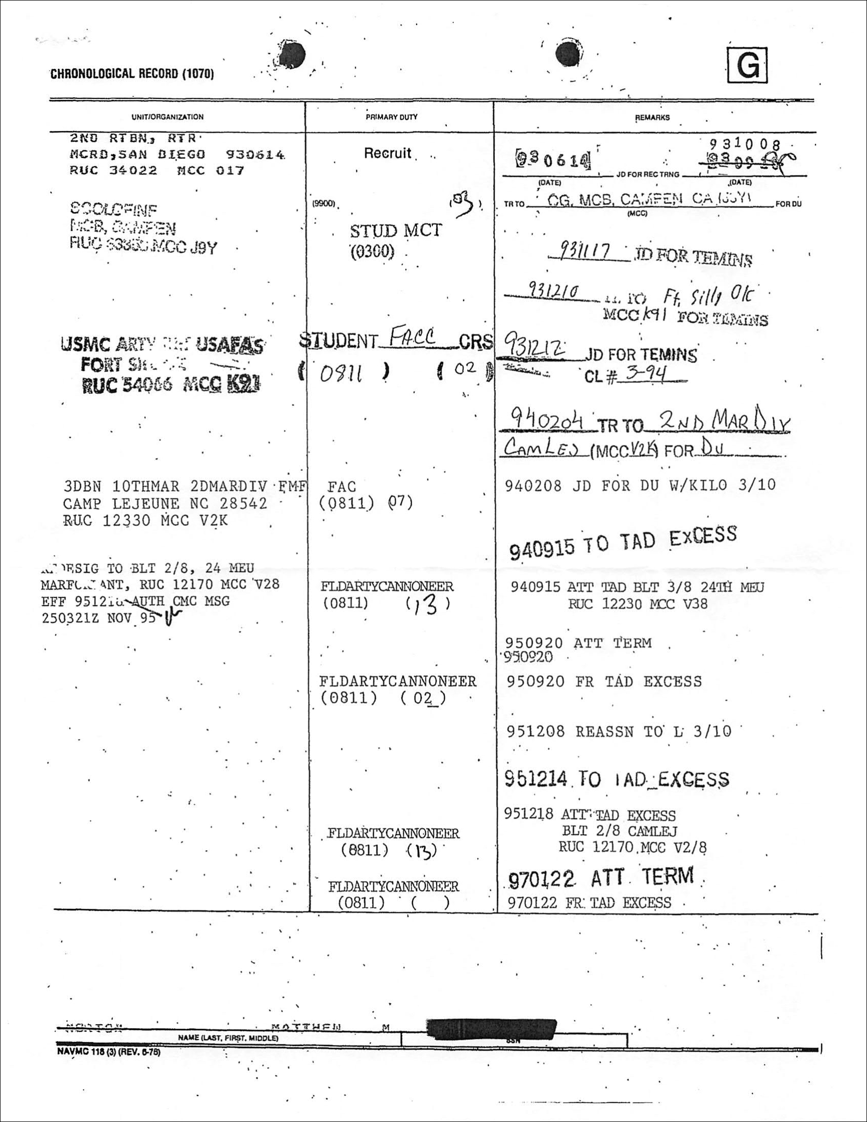 So, somewhere between MCRD San Diego, Fort Sill and Camp Lejune he caught the PTS of D and 3 x PH, 4 x CAR during the Clinton years?