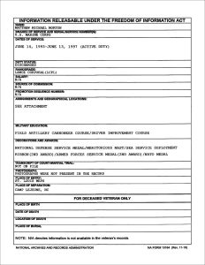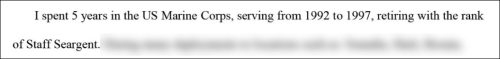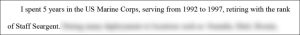 The length of service is consistent across all FOIA results – 1993-1997 – representing a four year enlistment. We find it odd that he claimed that he served for five (5) years in his book, but perhaps he was counting delayed entry time.