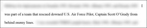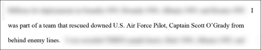Morton’s book also claimed that he was awarded three (3) Purple Heart medals for being wounded in combat, along with four (4) Combat Action Ribbons for service in Somalia (1993), Rwanda (1994), Albania (1995) and Bosnia (1995). He also claimed that he “was part of a team that rescued downed U.S. Air Force Pilot, Captain Scott O’Grady from behind enemy lines.”