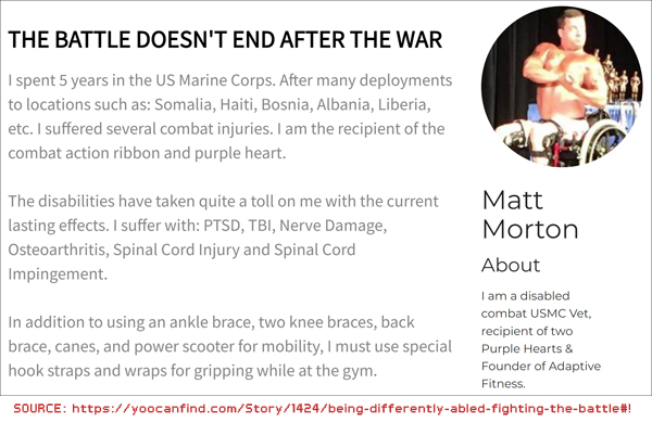 It’s probably not clear to many people whether or not Morton received combat injuries while in the Marines that lead to him being restricted to a wheelchair.