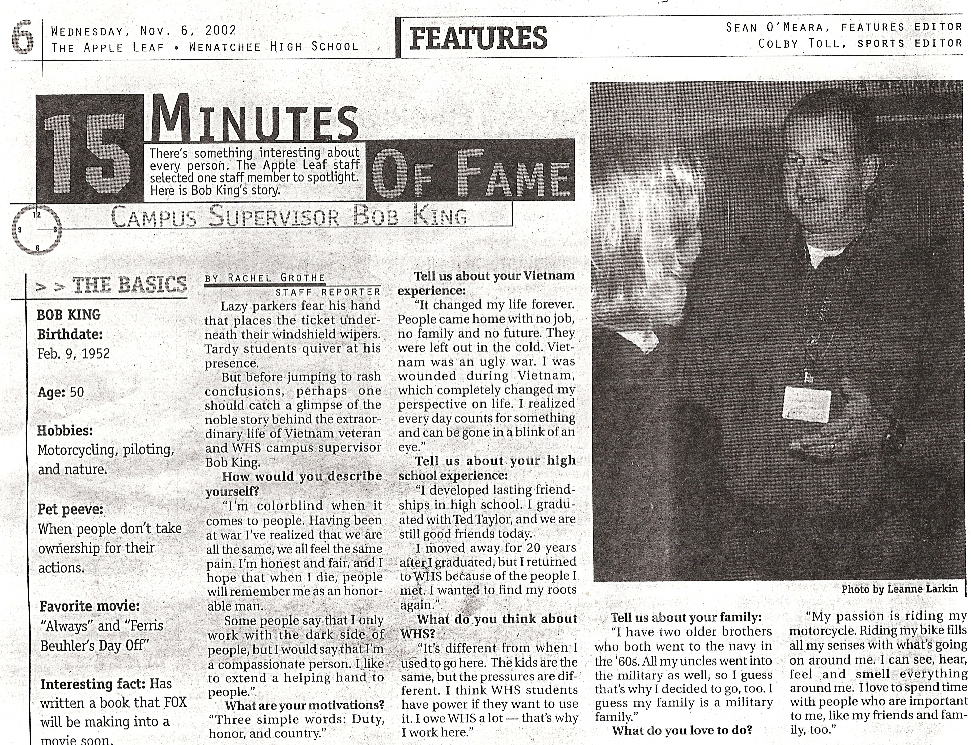 I’m sure you all remember the book I read and reviewed here named “Spooky 8; the final mission” and then I reviewed it’s author, Bob King, and got an email from Bob King. Technically, through all of that, Bob could have said that book was fiction and he was just drawing on his experiences and his imagination to write a novel – so technically, he’s not a phony soldier. Well, one of our readers dug up, in the archives of the local school paper in Wenatchee, WA, an interview from 2002 in which he actually claims to be a Vietnam veteran. Not only that, he claims that his experiences in Vietnam are what shaped his life. We all know from his records that he was a general’s driver in Fort Sill, OK after he dropped out of jump school – that was the extent of his military career.