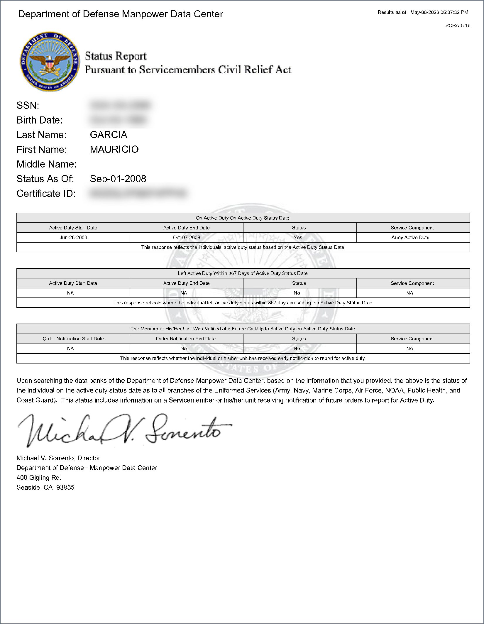The military service dates from DoD Manpower (SCRA) have now been posted in the blog above: