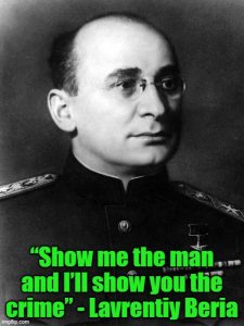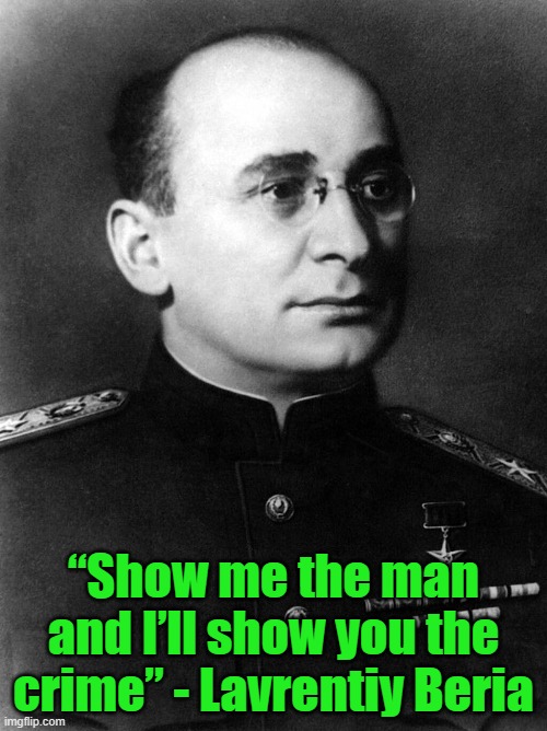 Actually, I think the correct translation of what Beria said in Russian was, “show me the man, and I will find you his crime.” The obvious reality was that just like our own New American Stasi, his secret police could trump up a false crime against anyone.