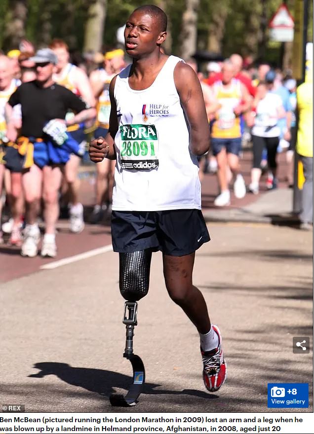 “Mr. McBean lost an arm and a leg and was expected to die on the flight home from the battlefield in Afghanistan. But after making a remarkable recovery, his original disabled badge taken away from him when he ran the London Marathon a year later.”