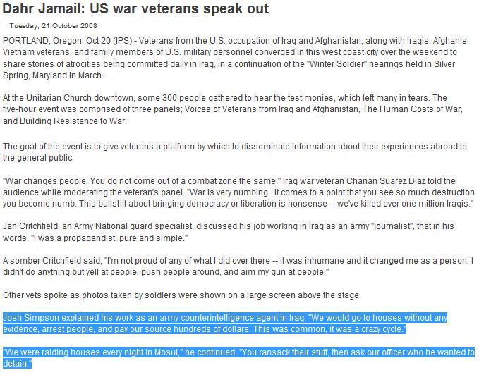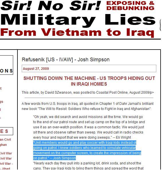 Notice that Dahr Jamail did two interviews with Simpson, and Simpson “fooled” Jamail into thinking he held two different jobs during his year in Iraq. Jamail couldn’t be bothered to verify Simson’s competing stories as long as the stories fit Jamail’s story line.