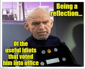 If that is how it goes down, I hope that Pennsylvania voters will remember how they got played and throw Fetterman’s replacement out on his or her ass in the next election in 2028. There’s stories going around that Fetterman’s wife is auditioning for the part. Unfortunately, I get the feeling that a majority of Pennsy voters just aren’t that bright.